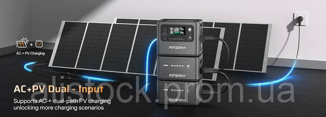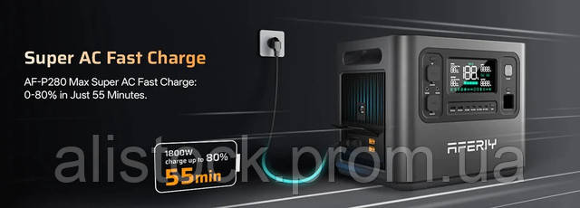 Портативна електростанція AFERIY P280 потужністю 2800 Вт заряджається від 18% до 80% лише за 55 хвилин від мережі змінного струму та підтримує сонячну потужність до 1200 Вт ( подвійна фотоелектрична зарядка через сонячні панелі та від генератора ). Завдяки чотирьом доступним варіантам зарядки ( змінний струм, сонячна енергія, від автомобіля або змінний струм + сонячна енергія) вона допоможе вам бути готовими до наступної подорожі або аварійного резервного живлення.