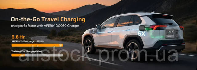 Заряджайте будь-де за допомогою зарядного пристрою AFERIY DC060 , який заряджає пристрій до 6 разів швидше в дорозі. Ідеально підходить для тривалих подорожей, перельотів по бездоріжжю або досліджень природи.