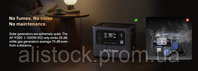 Без вихлопних газів, без шуму, без обслуговування. AF-P280 працює з рівнем шуму лише 25 дБ , що є чистою та тихою альтернативою галасливим генераторам — ідеально підходить як для використання в приміщенні, так і на вулиці.