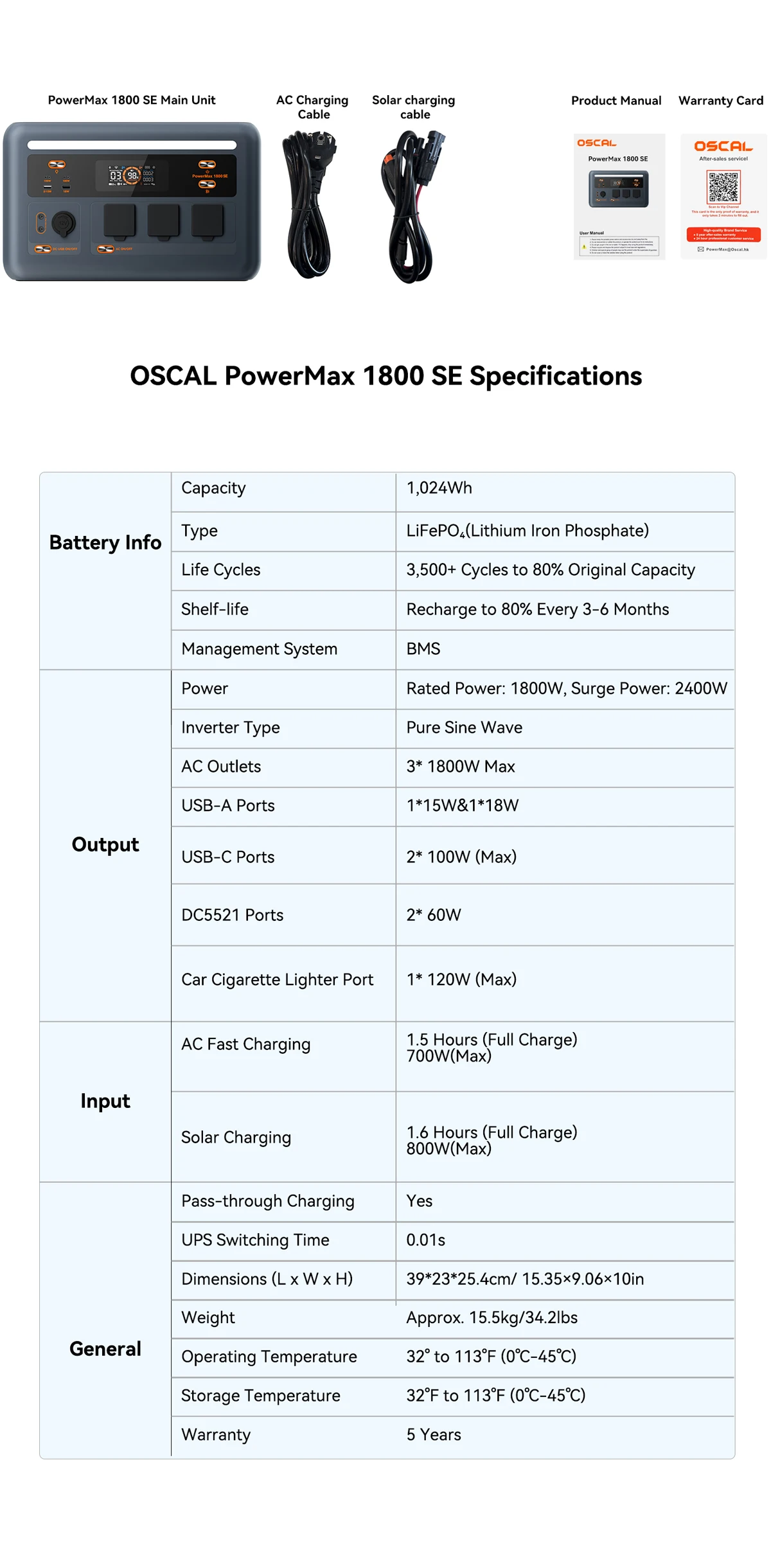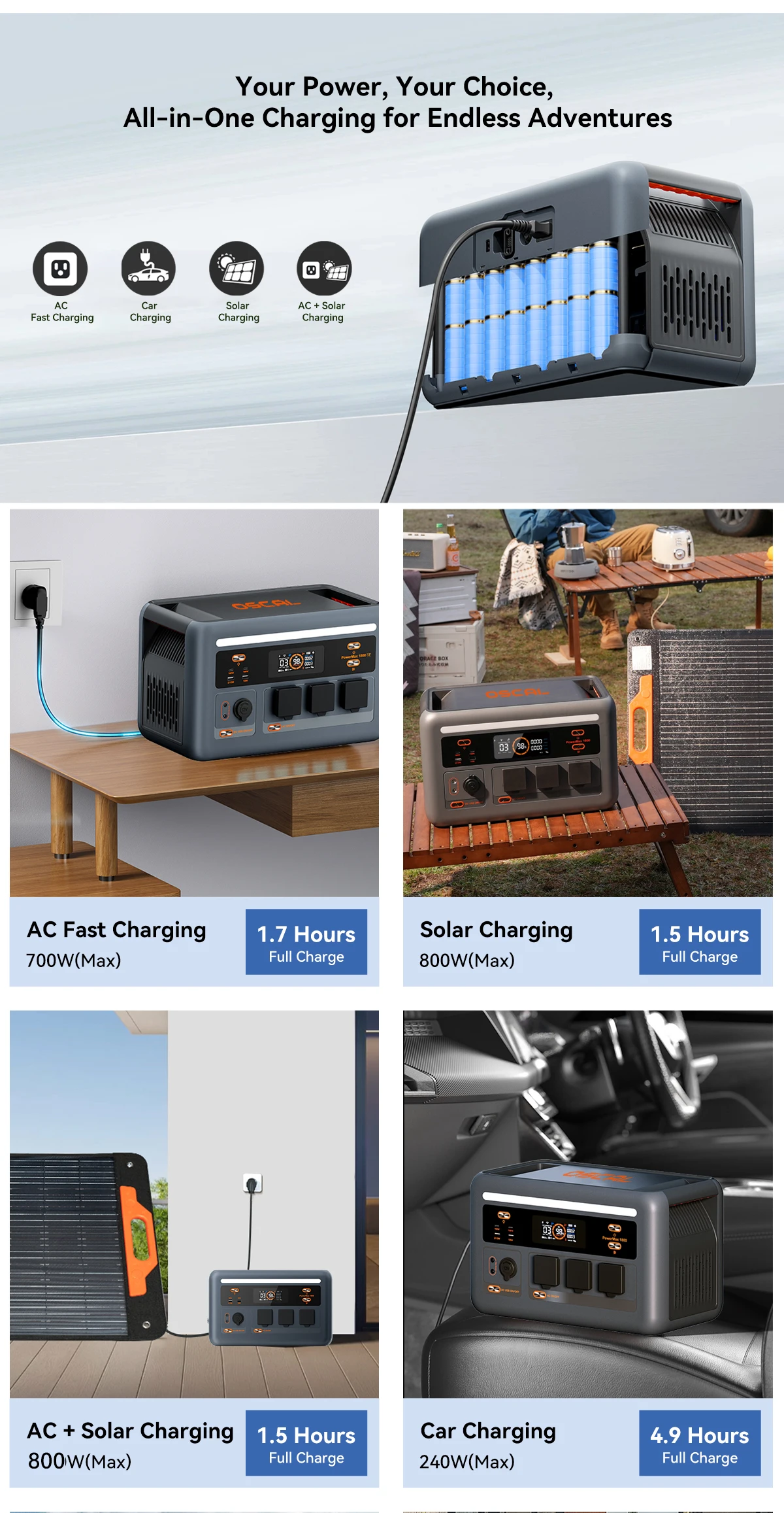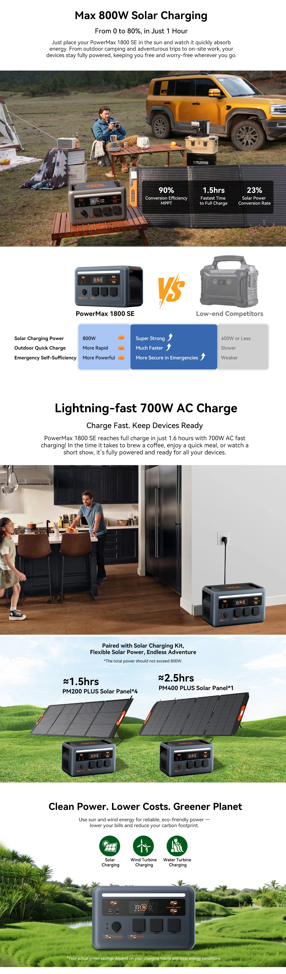 The Oscal Powermax 1800SE charging station is a powerful and compact solution for standby and backup power for homes, offices, and mobile applications. It combines a high 1800W output power, a reliable LiFePO4 battery, and advanced management features.