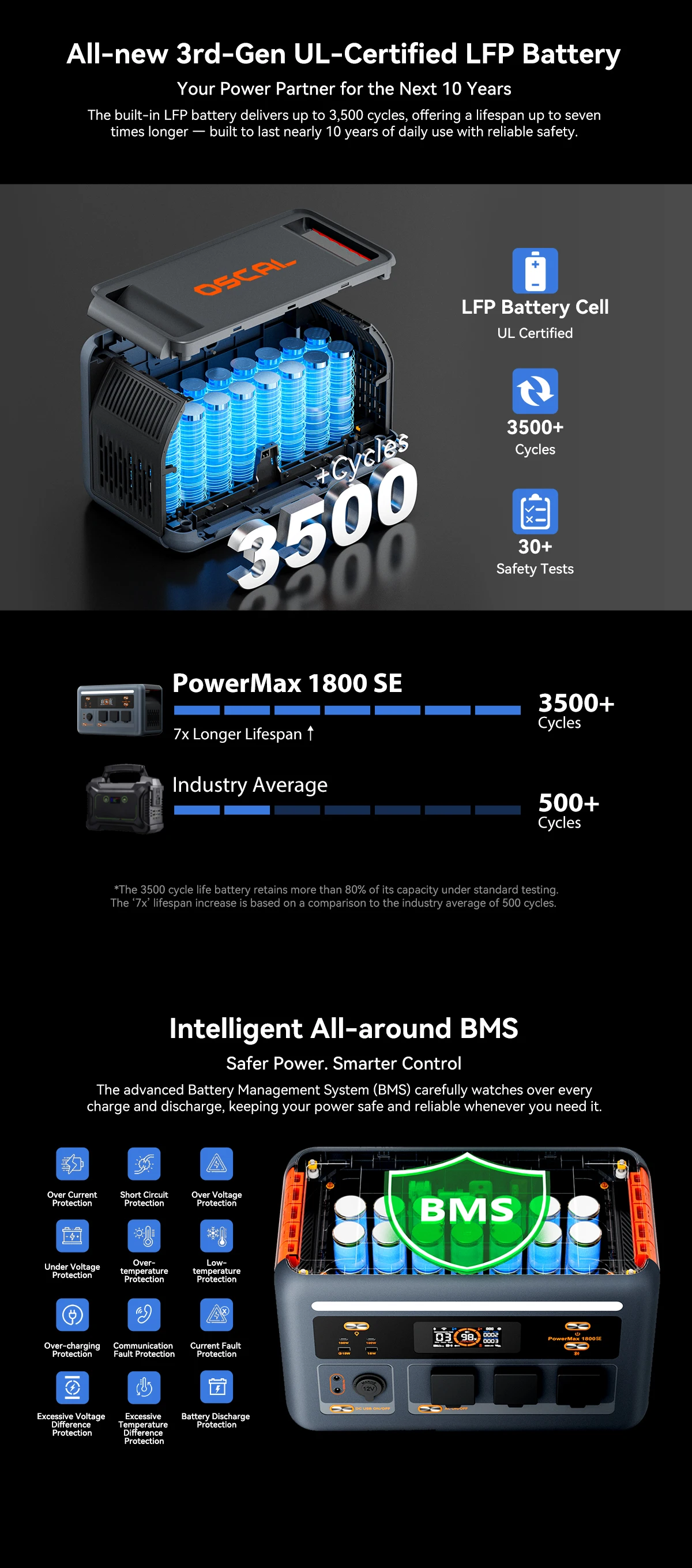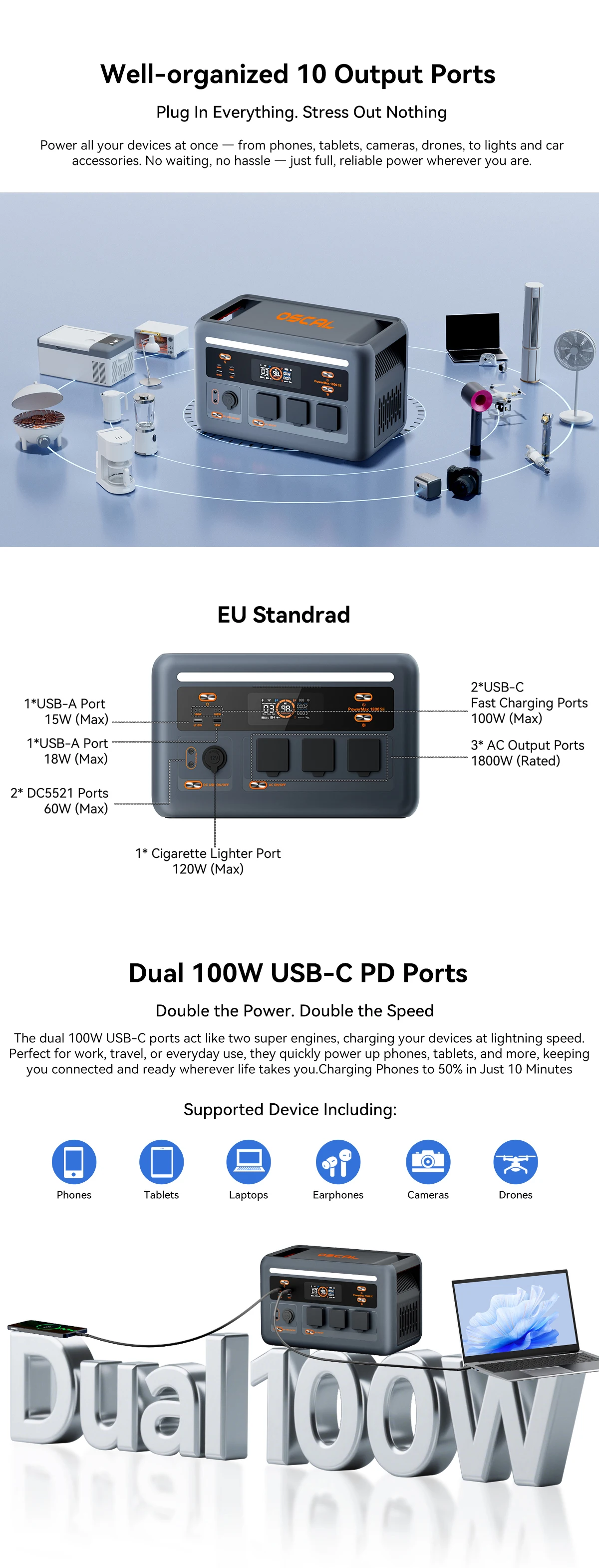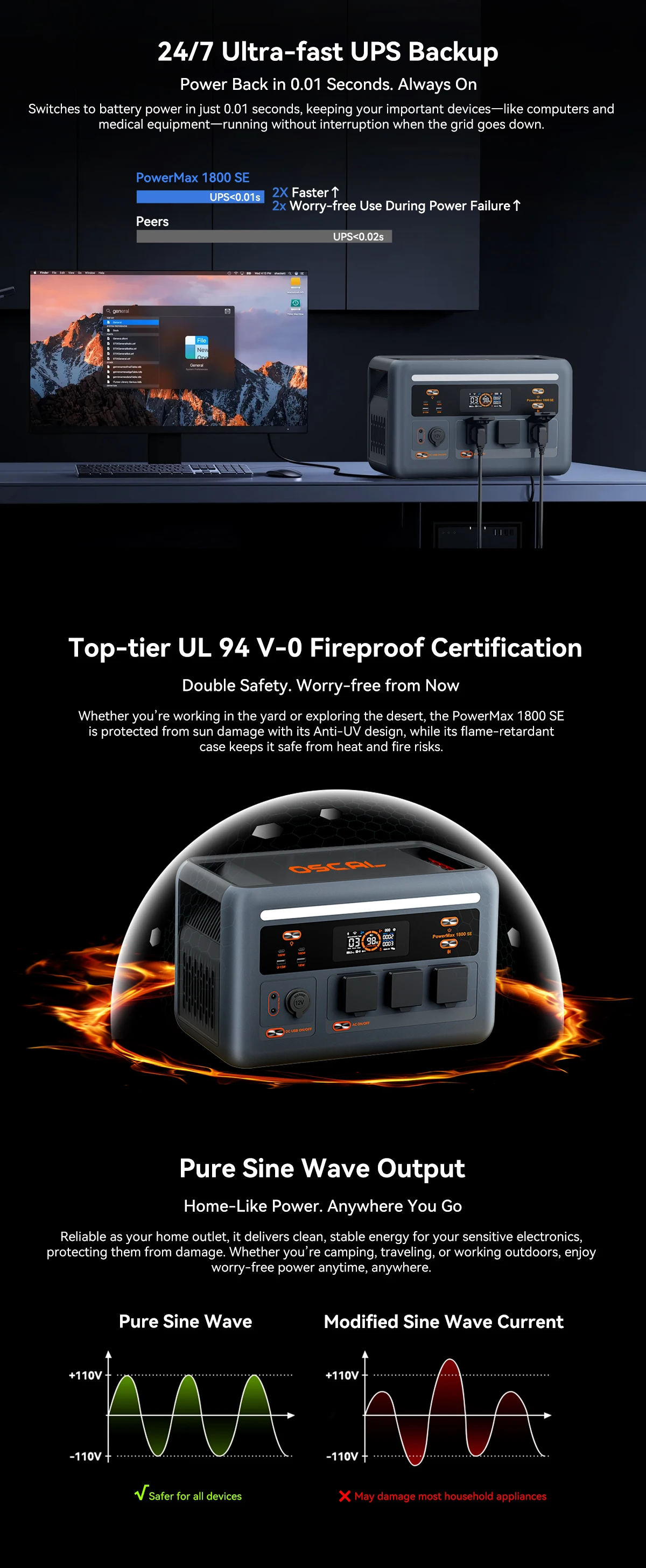 The Oscal Powermax 1800SE charging station is a powerful and compact solution for standby and backup power for homes, offices, and mobile applications. It combines a high 1800W output power, a reliable LiFePO4 battery, and advanced management features.