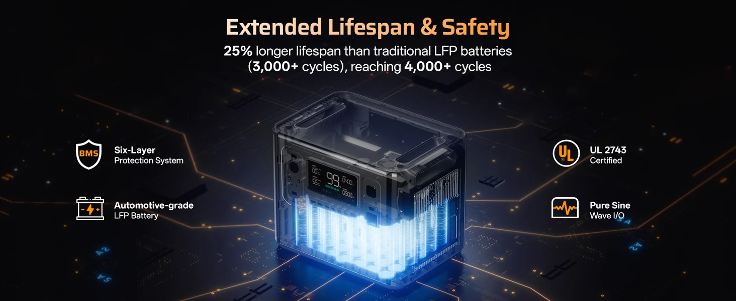 Акумулятор побудований на базі LiFePO₄ (літій-залізо-фосфатної) технології, що гарантує високу безпеку, стабільність роботи та понад 3500 циклів заряд-розряд без суттєвої втрати ємності.